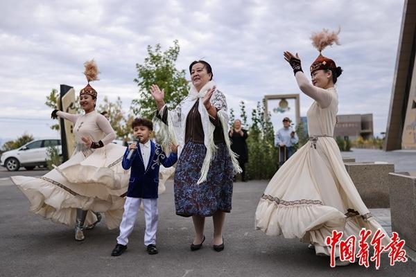 9月13日,新疆塔城地區(qū)額敏縣也迷里文化園,身著民族服飾的當(dāng)?shù)厝擞酶栉栌觼韰⒂^的客人。中青報·中青網(wǎng)記者 曲俊燕/攝