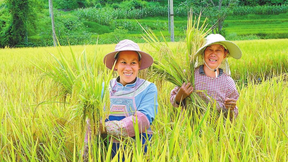 師宗縣五龍鄉(xiāng)牛尾村群眾收割稻谷。 本報通訊員 賈嚴(yán)/攝