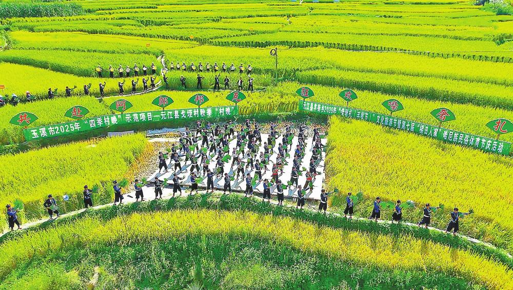 秋意漸濃,稻谷飄香。近日,元江哈尼族彝族傣族自治縣的萬畝梯田披上“金裝”,當(dāng)?shù)毓嶙迦罕娪瓉硪荒暌欢葢c祝豐收、感恩自然的重要傳統(tǒng)節(jié)日“喍奢扎”節(jié),梯田之上處處洋溢著豐收的喜悅。