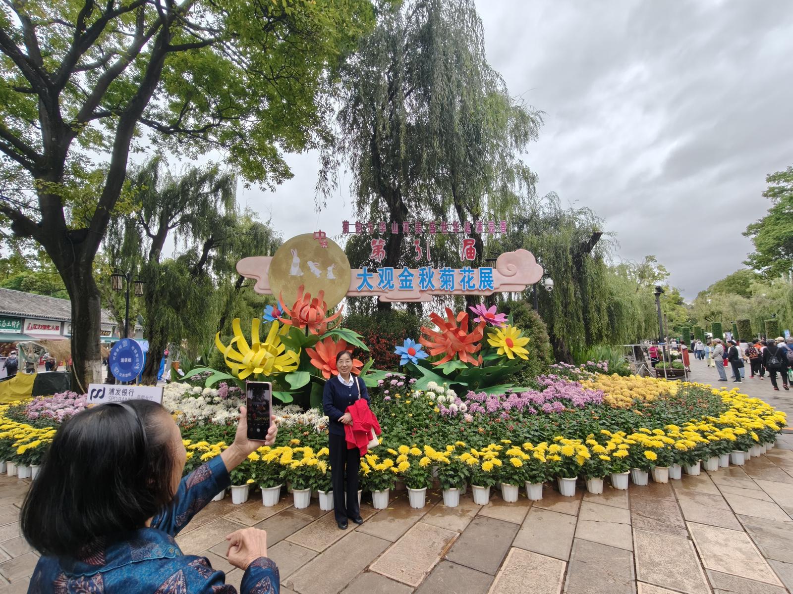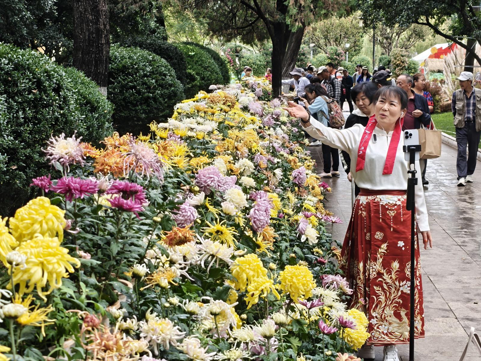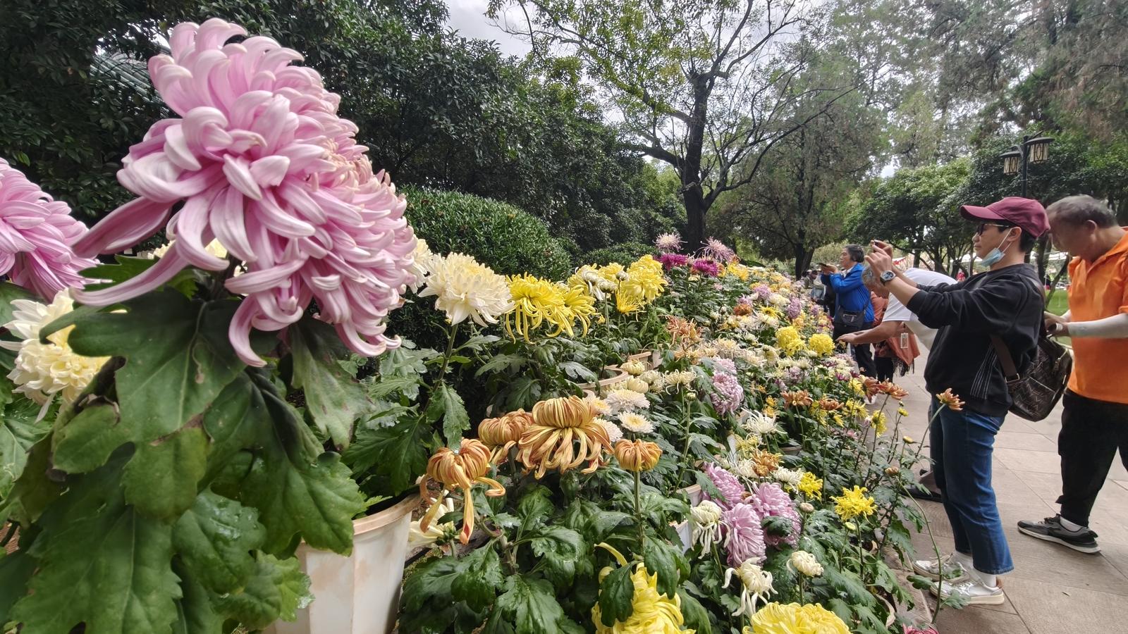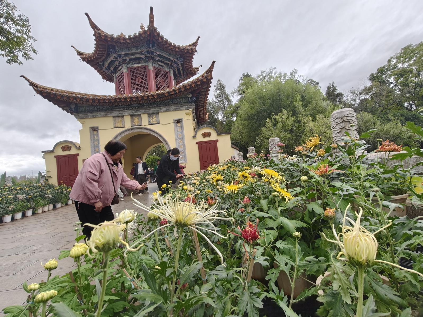 29日上午,記者來到昆明市大觀公園,一進(jìn)入公園,發(fā)現(xiàn)到處都是各種各樣的菊花,有的初開,有的打蕾,給人一種花開盛世之美感。在近華浦,這里是菊花的集中展示區(qū),近華浦主路臨水一側(cè)的草坪花架上陳列超過1.3米的懸崖菊,菊枝披垂、如瀑傾瀉,形成一道絢麗奪目的菊花瀑布,極具視覺沖擊力。在催耕館內(nèi),集中展示12盆菊花盆景,創(chuàng)新融合菊花栽培與盆景藝術(shù),涵蓋大型樹樁、叢林式、文人樹及圖案式等多種盆景類型,通過盆景技法對菊花進(jìn)行整形修剪,探索菊花藝術(shù)表現(xiàn)新形式。近華浦門洞出口處則設(shè)置寓意祥瑞的菊藝小品,融合鮮艷色彩與喜慶元素,營造出濃厚的節(jié)慶氛圍。