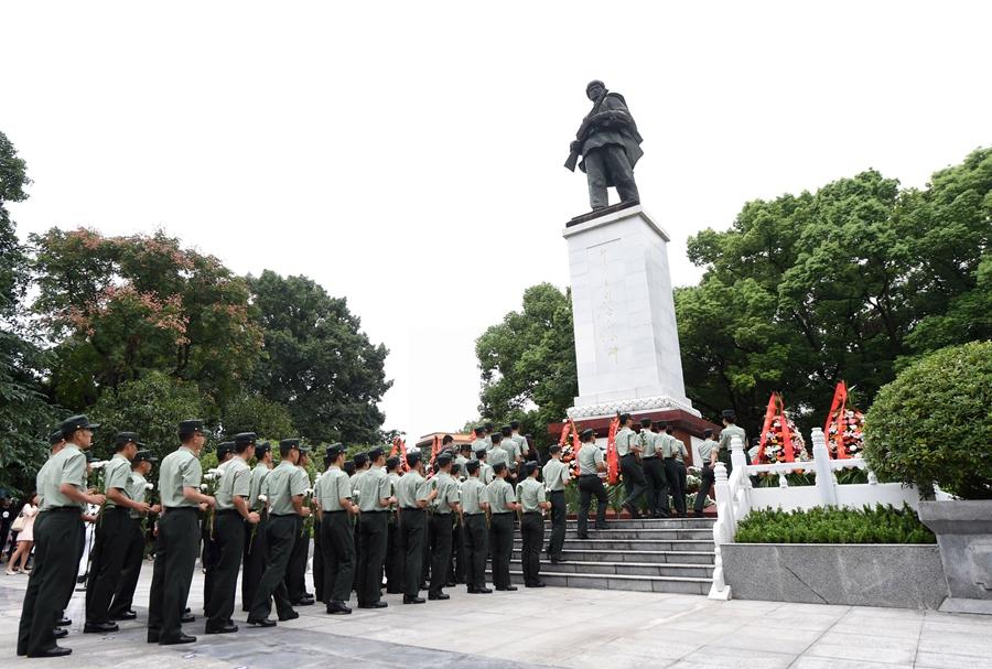 在位于重慶市銅梁區(qū)的邱少云烈士紀念館,武警官兵向邱少云烈士紀念碑獻花(2017年9月30日攝)。新華社記者 唐奕 攝