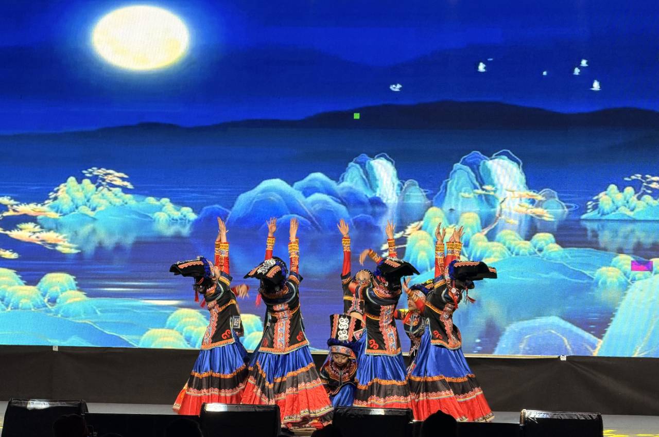 戲曲聯(lián)唱《祖國(guó)你好》《中國(guó)脊梁》以傳統(tǒng)唱腔表達(dá)了對(duì)祖國(guó)的美好祝愿。隨后,《如愿》《但愿人長(zhǎng)久》的旋律響起,歌者溫婉的演唱與中秋的月色相得益彰,不少觀眾隨著節(jié)奏輕輕晃動(dòng)身體,沉浸在團(tuán)圓的溫馨氛圍中。彝族女子群舞《烏蒙麗影》展現(xiàn)了濃郁的地方特色,舞者們用優(yōu)美的動(dòng)作展現(xiàn)出烏蒙山區(qū)的少數(shù)民族風(fēng)情。
