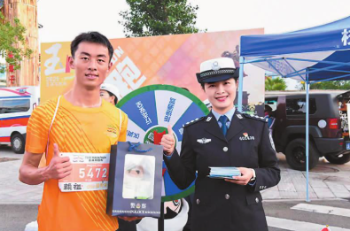 剛跑完健康跑的跑友被交警卡通玩偶“小路小愛”和反詐警犬“拉多”所吸引,紛紛合影留念?!翱鞓繁寂堋づc交通安全同框”互動問答、反詐“擼狗”等主題打卡區(qū)也被大家熱情圍觀。“跑完步還能學(xué)知識、贏禮物,很有意義!”參加完活動的跑友和游客紛紛表示。