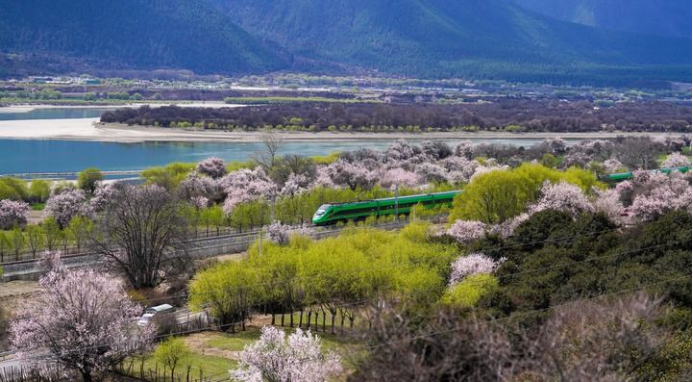 2025年4月2日,復(fù)興號列車穿行在拉林鐵路林芝段。新華社記者 晉美多吉 攝