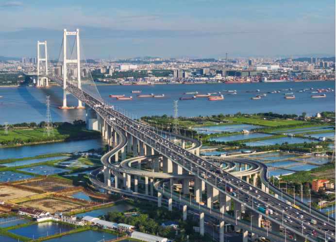 2024年10月2日,廣東南沙大橋上的車流和獅子洋水道的船舶來來往往(無人機(jī)照片)。新華社記者 劉大偉 攝