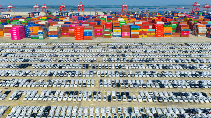 2025年10月4日在江蘇省港口集團(tuán)南京港龍?zhí)陡蹍^(qū)拍攝的準(zhǔn)備裝船出口的汽車(無人機(jī)照片)。新華社發(fā)(楊素平攝)