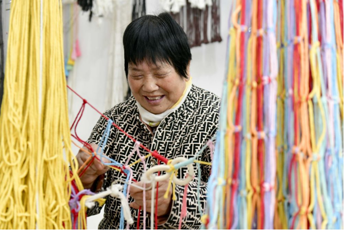 2024年12月13日,在山東省惠民縣姜樓鎮(zhèn)一處巾幗共富工坊,工作人員在編織繩網(wǎng)。新華社記者 郭緒雷 攝