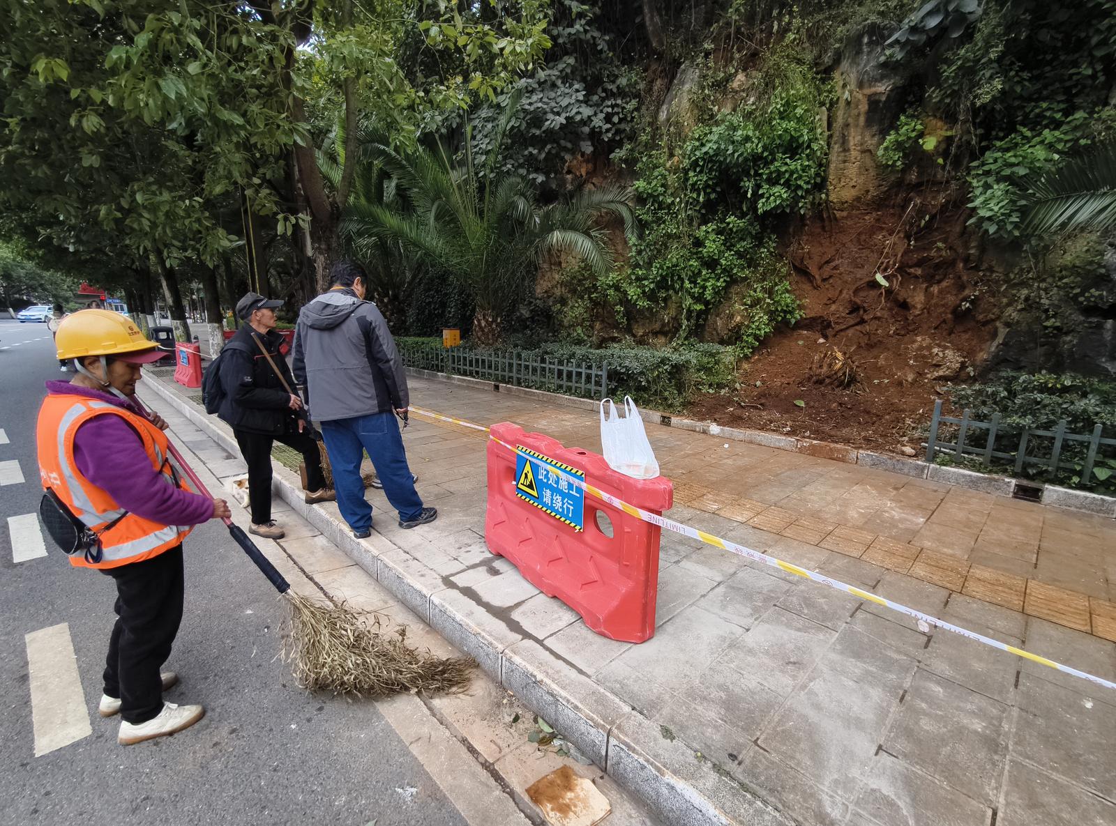 11月4日,昆明圓通山青年路段部分外墻發(fā)生巖石崩落,多塊巖石從山體崩落至綠化帶,部分大體積巖石沖破綠化帶護欄砸到人行道上,占據(jù)大半路面。事發(fā)路段已經(jīng)拉起警戒線,截至11月5日中午,落石已經(jīng)被相關(guān)部門清理,但水馬隔離危險區(qū)域仍未撤除。