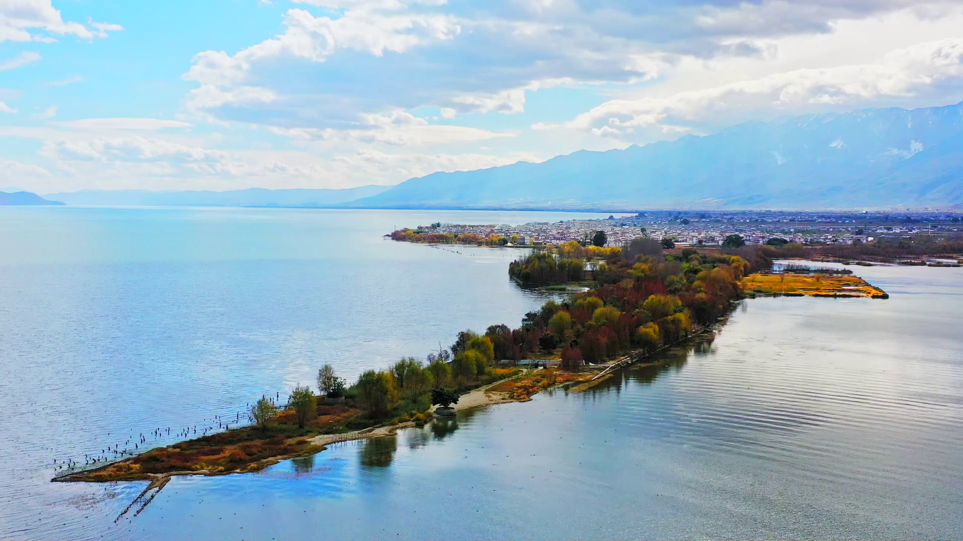 我是總臺記者李騰飛,給大家推薦我非常喜歡的地方——云南大理。秋天的大理,天高云淡,氣溫舒適,洱海清波蕩漾,岸邊的樺樹也披上了“秋裝”。第一站,我們不開車,綠色出行,選擇騎行或者漫步都可以,先來到洱海生態(tài)廊道。