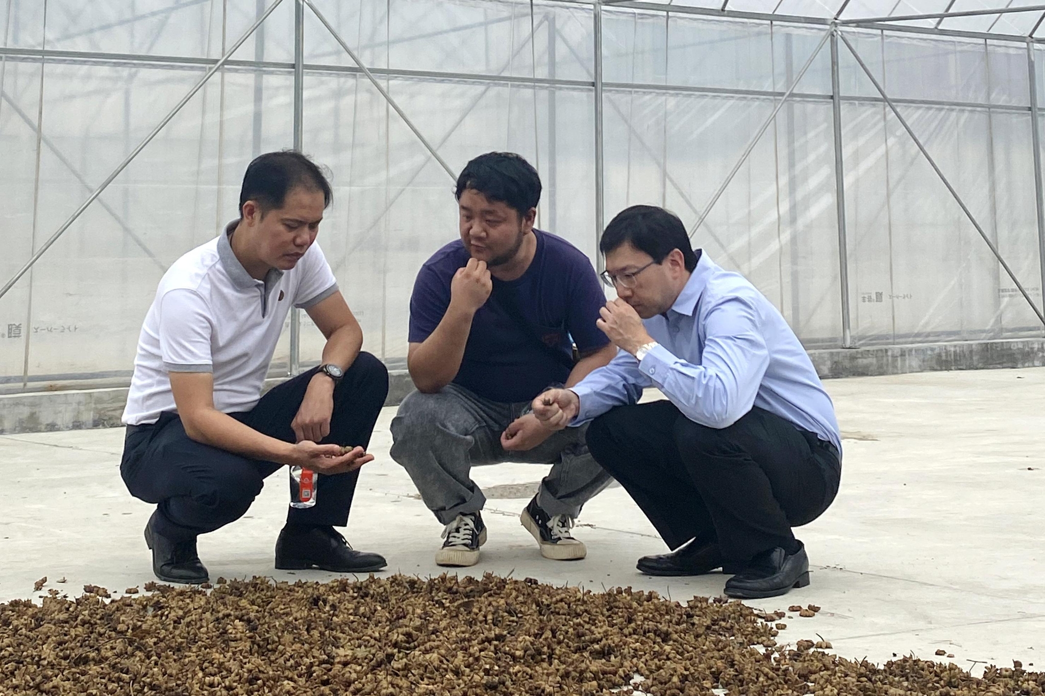 云南省科技特派員、昆明理工大學(xué)教授郭超凡(中)在和企業(yè)負責(zé)人查看八角干品情況。受訪單位供圖