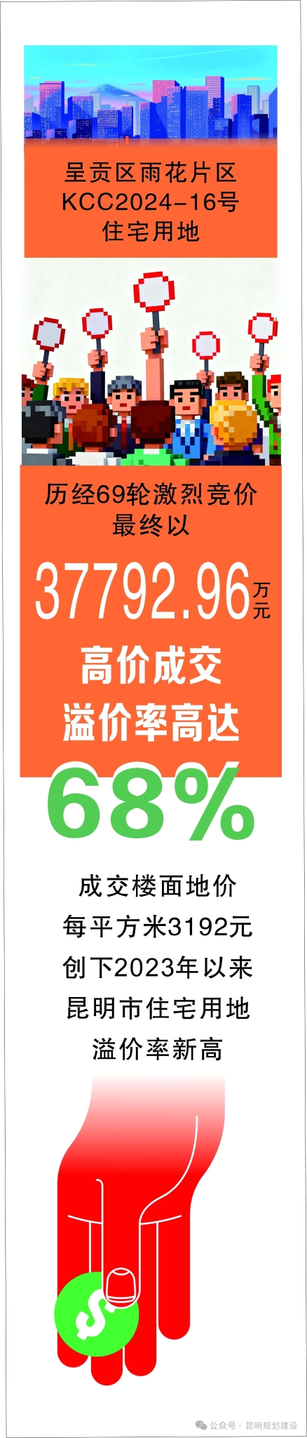 11月5日,呈貢區(qū)雨花片區(qū)KCC2024-16號住宅用地以37792.96萬元成交,溢價率高達68%,創(chuàng)下2023年以來昆明市住宅用地溢價率新高。