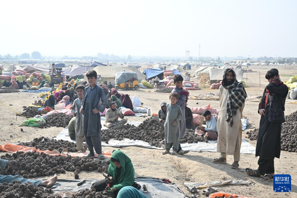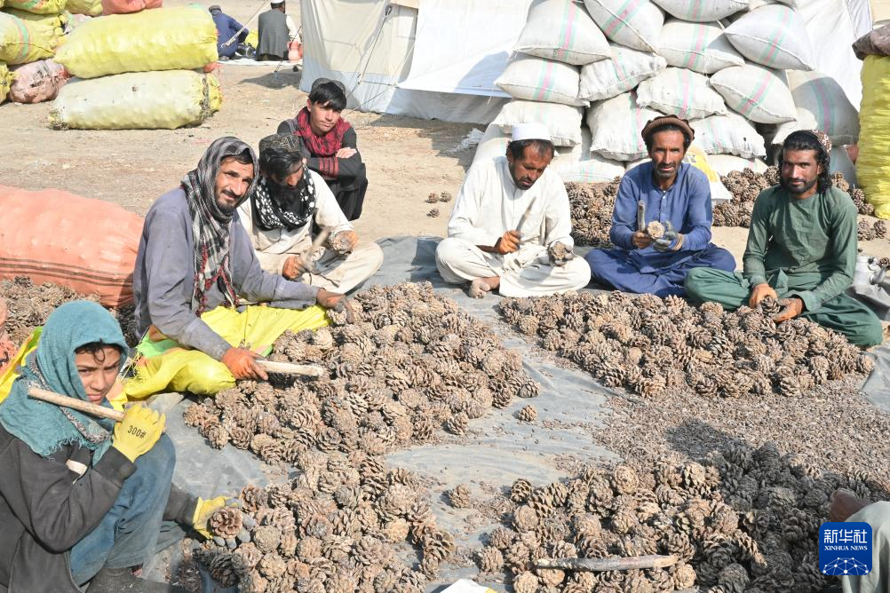 10月28日,在阿富汗霍斯特省的松子加工交易市場,當地民眾圍坐在一起手工采集松子。新華社記者張藝繽攝