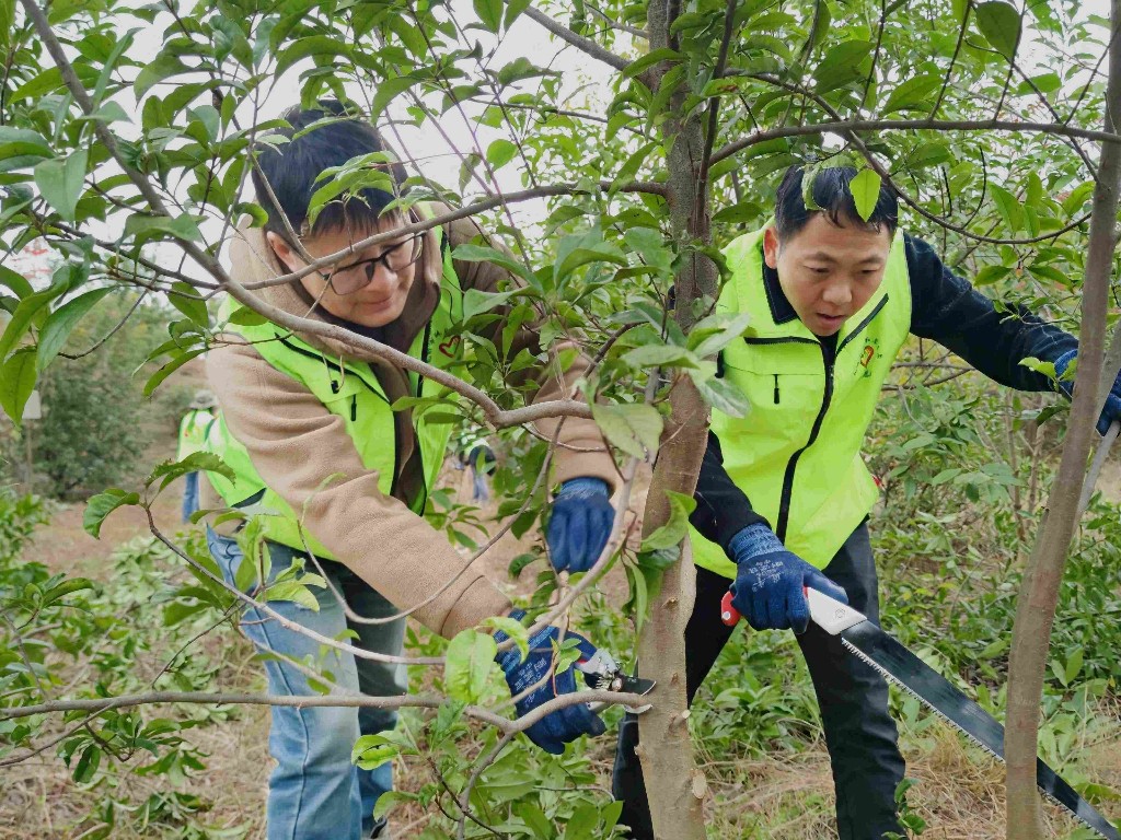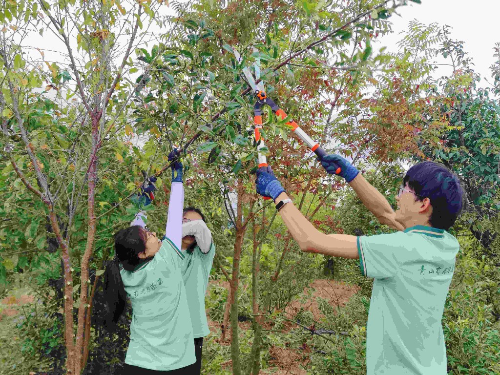活動(dòng)現(xiàn)場(chǎng),邀請(qǐng)?jiān)颇鲜×挚圃簩?zhuān)家結(jié)合現(xiàn)場(chǎng)植被生長(zhǎng)情況,向大家詳細(xì)講解樹(shù)種的生長(zhǎng)習(xí)性和管護(hù)方法,科普林草生態(tài)知識(shí)、傳遞生態(tài)保護(hù)理念。在專(zhuān)業(yè)指導(dǎo)下,林草工作者與師生們分組協(xié)作,完成割灌除草、人工修枝等撫育作業(yè)。