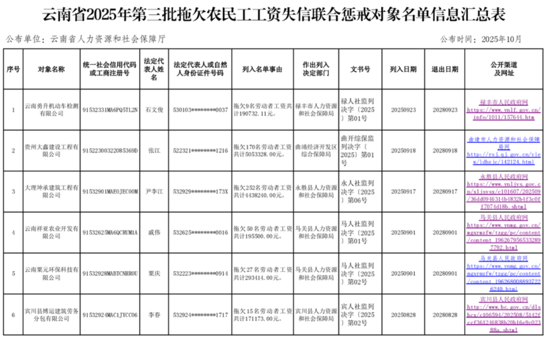 近日,云南省人力資源和社會保障廳公布了2025年第三批拖欠農(nóng)民工工資失信聯(lián)合懲戒對象名單,涉及6戶用人單位。詳情如下:
