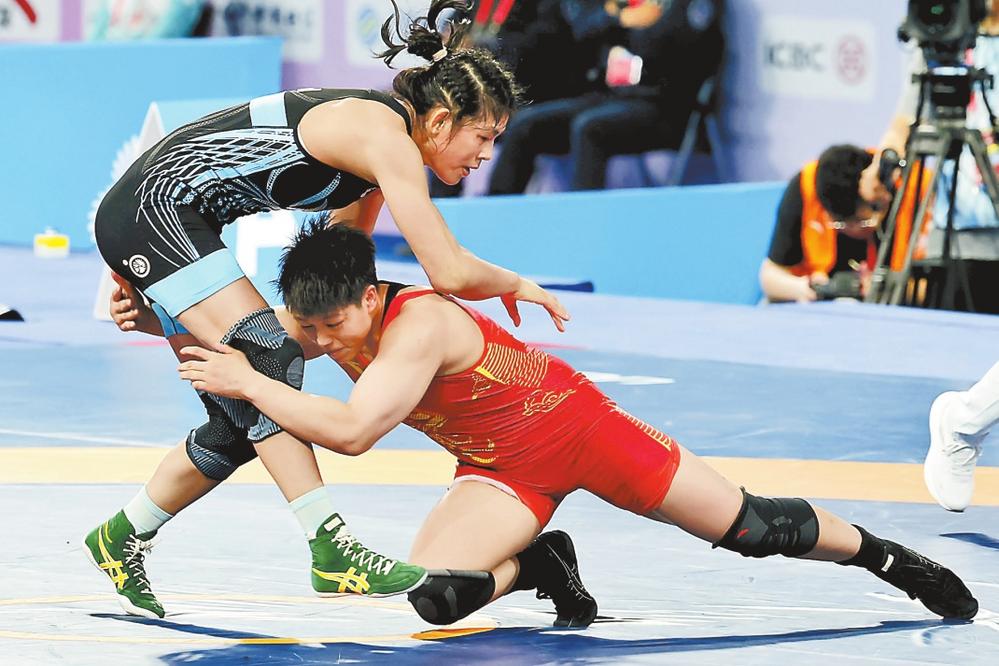 云南選手龍佳(紅方)在十五運會女子自由式摔跤68公斤級比賽中。