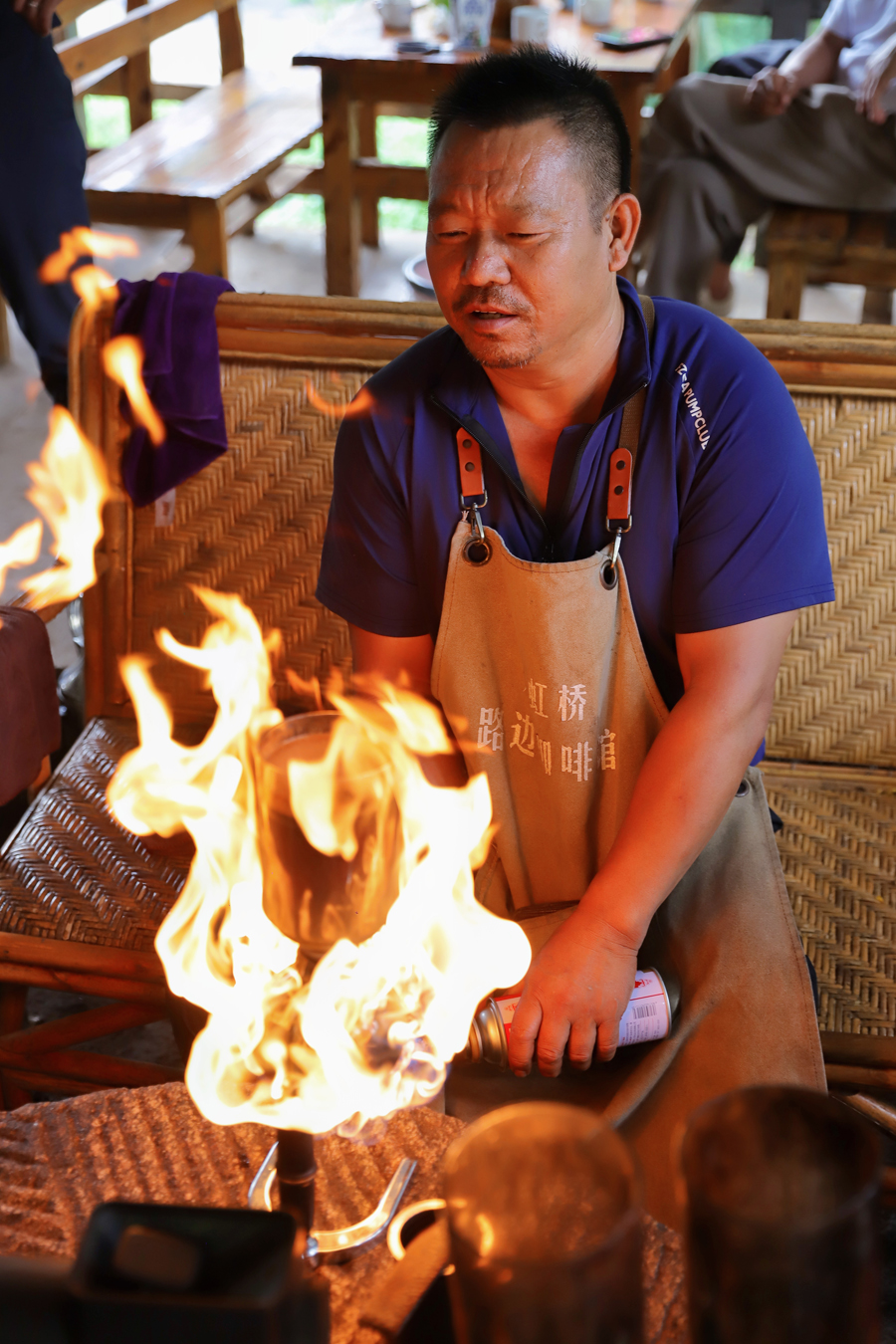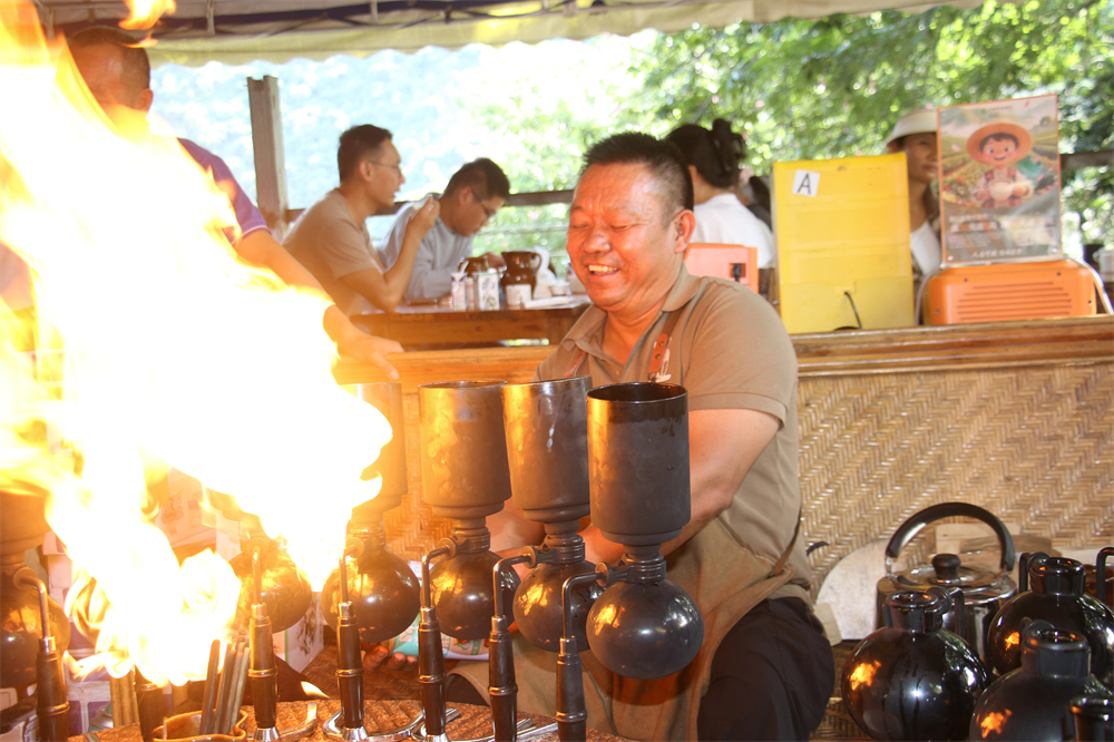 清晨的怒江峽谷還籠罩在薄霧中,雙虹橋畔的“路邊咖啡館”已熱鬧非凡。以老磨盤(pán)為桌,噴槍火焰躍動(dòng),濕毛巾輕拭——館主李金合制作“火燒咖啡”的流程,已成為一場(chǎng)備受期待的表演。