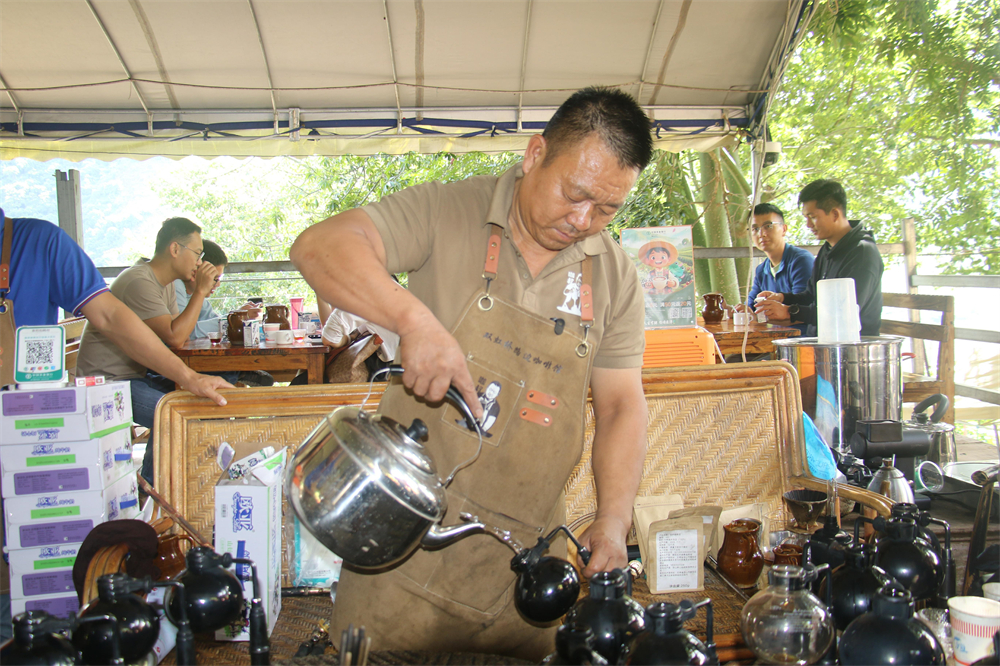 沿六曼公路行至雙虹橋,人未至,香已迎。來(lái)自各地的游客舉著手機(jī),記錄這難忘時(shí)刻。李金合手法嫻熟,在升騰的熱氣中介紹:“我們的咖啡從種植到烘焙全由我完成,連調(diào)味所用的蜂蜜也采自自家蜂群,能充分釋放咖啡的醇厚風(fēng)味?!?/p>