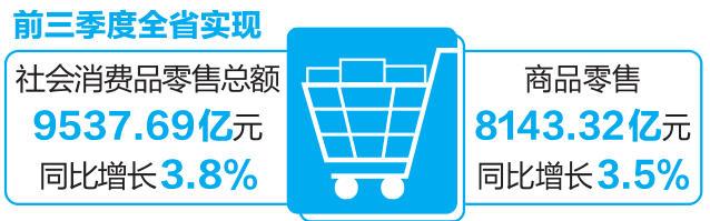 來自省統(tǒng)計(jì)局的數(shù)據(jù)顯示,前三季度,全省實(shí)現(xiàn)社會(huì)消費(fèi)品零售總額9537.69億元,同比增長(zhǎng)3.8%。按經(jīng)營(yíng)所在地分,城鄉(xiāng)消費(fèi)持續(xù)增長(zhǎng),鄉(xiāng)村增速快于城鎮(zhèn)。城鎮(zhèn)實(shí)現(xiàn)消費(fèi)品零售額7889.52億元,同比增長(zhǎng)3.7%;鄉(xiāng)村實(shí)現(xiàn)消費(fèi)品零售額1648.17億元,同比增長(zhǎng)4.5%,增速較城鎮(zhèn)高0.8個(gè)百分點(diǎn)。