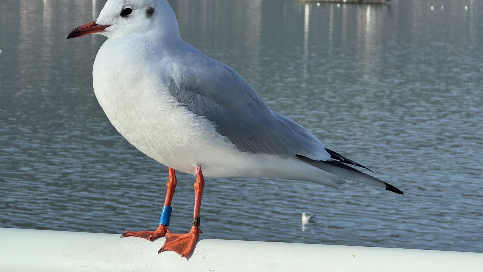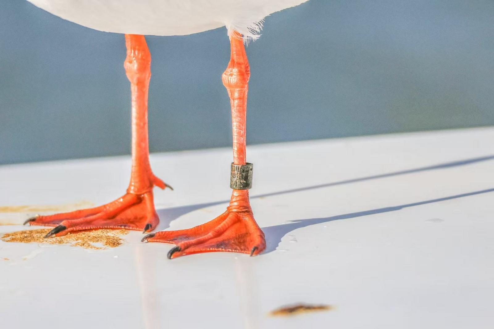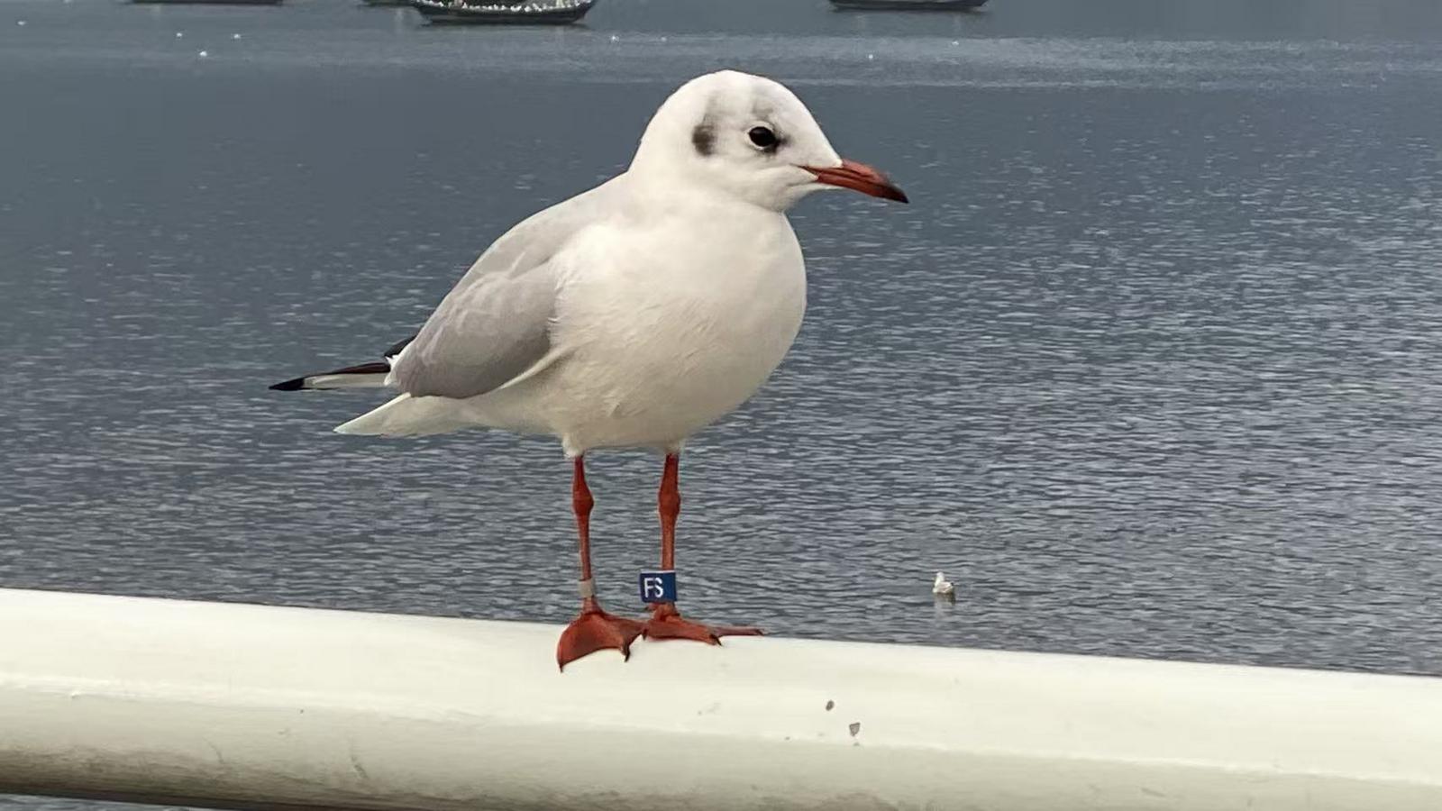 11月24日,記者在昆明海埂大壩看到,停在欄桿或柱子上的紅嘴鷗,有的腳上佩戴著天藍色的塑料環(huán),偶爾也能見到腳戴早期金屬環(huán)的個體,它們共同見證著一場持續(xù)近四十年的科學探尋與守護。