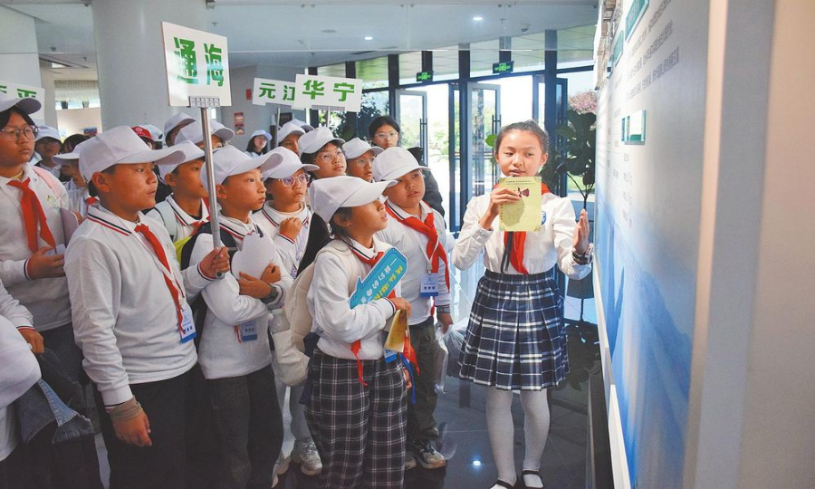 在“行”的環(huán)節(jié),“小手拉大手”家庭環(huán)保行動全面鋪開,產(chǎn)生聯(lián)動效應(yīng)。孩子們化身環(huán)保監(jiān)督員,督促家長使用菜籃子代替塑料袋、仔細記錄家庭用水量并踴躍參與社區(qū)垃圾分類活動。在云南江川星云湖國家濕地公園,學(xué)生組成的“紅領(lǐng)巾巡湖隊”沿湖清理垃圾,實地觀察入湖河道水質(zhì)情況;澄江市規(guī)劃館里,學(xué)生講解員向游客介紹撫仙湖“湖泊革命”的歷程;玉溪市科技館里,“小小星火”紅領(lǐng)巾講解員向參觀者介紹環(huán)保科技展品,分享生態(tài)環(huán)保知識,從節(jié)水節(jié)電的小發(fā)明到資源循環(huán)利用的新創(chuàng)意。