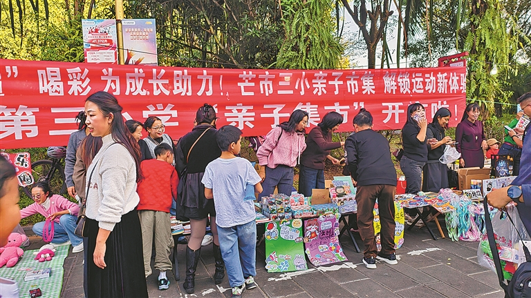 親子市集聚焦公益性“舊物循環(huán)·親子互動(dòng)”環(huán)保社交主題,芒市三小的學(xué)生化身活力滿滿的“小小攤主”,帶著閑置玩具、書籍、手作好物擺起攤位,用“以物換物”的方式傳遞環(huán)保理念、收獲交流樂趣。四年級(jí)小姑娘唐志瑤的攤位前,媽媽親手制作的精美發(fā)飾與小巧挎包整齊擺放,她略帶羞澀地主動(dòng)與詢價(jià)顧客交流介紹,臉上滿是認(rèn)真模樣:“哥哥進(jìn)場(chǎng)看球賽,我就在場(chǎng)外守著攤位,給市集添點(diǎn)熱鬧!”稚嫩的話語(yǔ)里滿是熱情,成為親子市集里一道暖心風(fēng)景線。