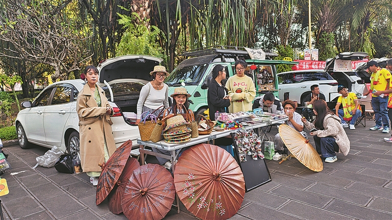后備箱市集則盡顯創(chuàng)意巧思,一排排汽車后備箱敞開變身“移動(dòng)潮店”,是潮流好物聚集地,也是網(wǎng)紅打卡新地標(biāo)。醇香咖啡、清新石斛花、特色民族文創(chuàng)手作等商品錯(cuò)落擺放,每一件都藏著攤主的審美與心意。對(duì)攤主們而言,銷量并非首要目的,精心布置攤位、打造濃郁德宏風(fēng)情打卡點(diǎn),與往來(lái)游客分享本地特色、傳遞生活熱愛,才是這場(chǎng)市集之旅的核心意義。