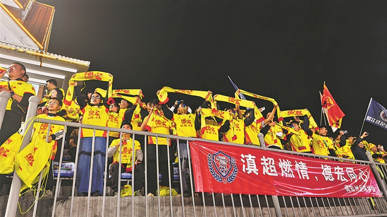 一抹亮眼的黃色在賽場(chǎng)看臺(tái)綻放光彩,這是德宏球迷自發(fā)組建的助威方陣。他們保持文明觀賽的良好風(fēng)貌,持續(xù)為家鄉(xiāng)德宏隊(duì)注入昂揚(yáng)斗志。不同于官方組織的統(tǒng)籌安排,這些球迷團(tuán)體源于本土球迷的共同熱愛,自發(fā)相聚、攜手助威,用一聲聲吶喊助威表達(dá)對(duì)家鄉(xiāng)球隊(duì)的深情厚誼。在球迷心中,觀賽從不只是靜靜旁觀,他們精心編寫助威口號(hào)、默契配合把控吶喊節(jié)奏、親手制作飽含心意的應(yīng)援物件,還以滿腔熱忱為球隊(duì)創(chuàng)作專屬歌曲。每一份細(xì)致籌備,都是德宏足球最堅(jiān)實(shí)的后盾與最暖心的支撐。