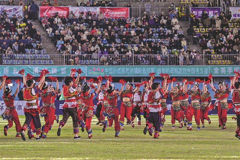 客隊(duì)紅河也帶來(lái)精心準(zhǔn)備的彝族歌舞《馬纓花》,歡快舞步、嘹亮歌聲回應(yīng)著暖冬德宏的熱情與包容,每一個(gè)動(dòng)作、每一段旋律都傳遞著兩地情誼,收獲熱烈掌聲,民族風(fēng)情與體育熱忱在此刻完美交融。