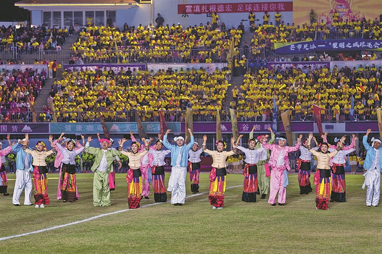 文藝表演率先拉開盛宴序幕。合唱《大中華》震撼猶在,身著傣族、景頗族等民族服飾的演員踏歌而來(lái)。德宏隊(duì)隊(duì)歌《邊境之光》悠揚(yáng)唱響,隨后融入了傣劇元素的表演伴著古典音樂以現(xiàn)代的表演方式再現(xiàn)少數(shù)民族璀璨文化,全民歌曲《樣樣好》《如哩金旺》響起,傣家青年姑娘身著艷麗服飾,踏著輕快舞步歡快起舞,靈動(dòng)裙擺隨節(jié)奏翻飛,球迷觀眾紛紛跟著旋律鼓掌附和,歌聲掌聲交織成歡樂樂章。