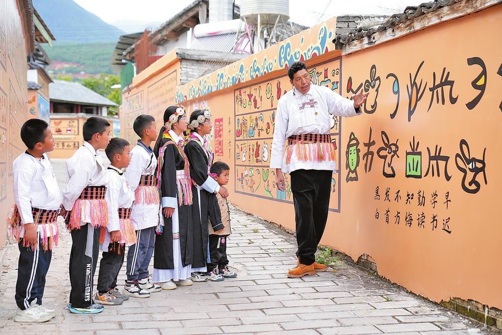 迪慶藏族自治州州級非物質(zhì)文化遺產(chǎn)代表性傳承人和樹坤,以東巴壁畫和千年古訓(xùn)為題,為三壩納西族鄉(xiāng)白地村的孩子們解讀勤學(xué)、修身與家風(fēng)建設(shè)的意義。云南日報(bào) 通訊員楊雪婷/攝)