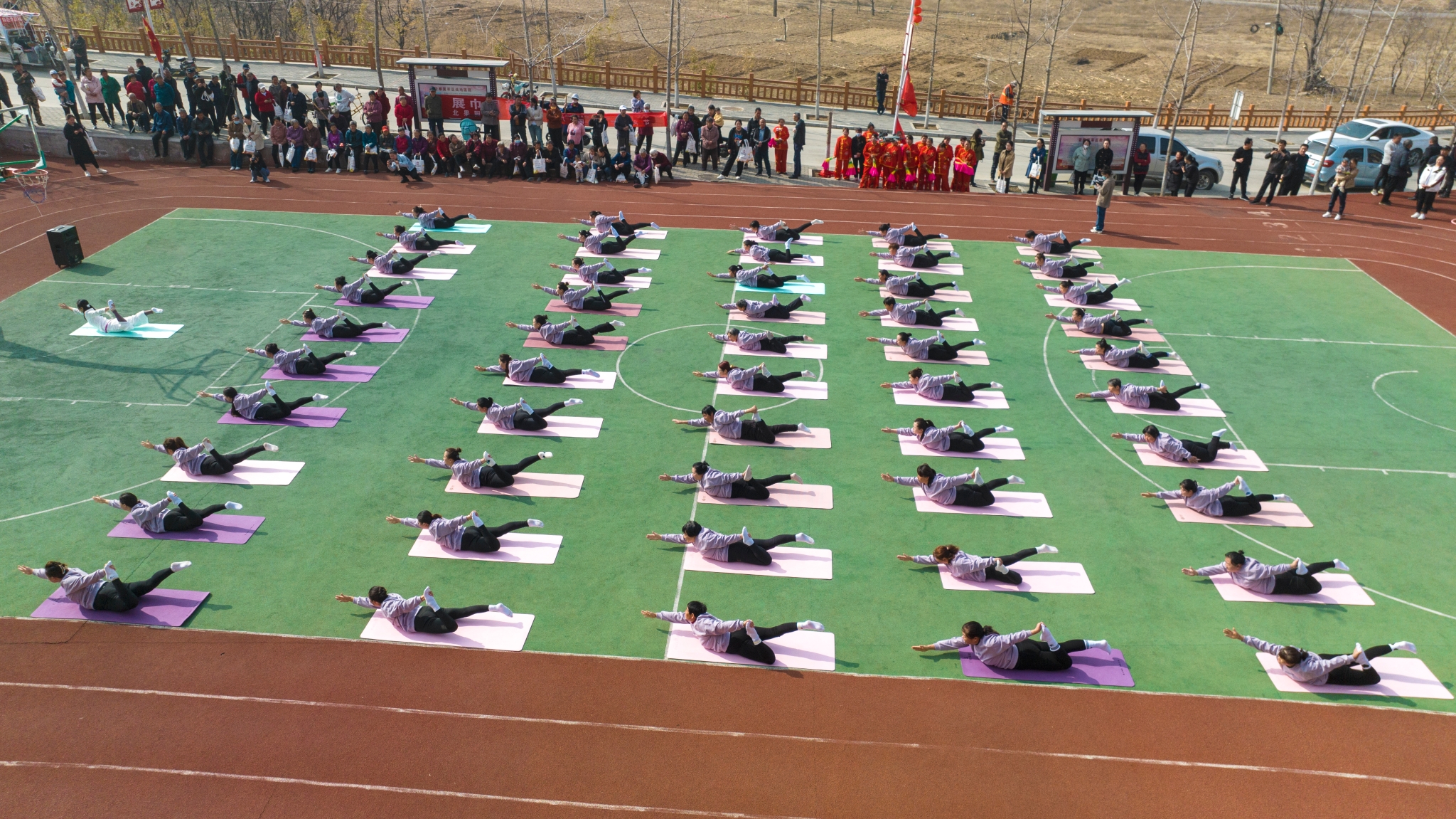 村民在操場(chǎng)練瑜伽。阜平縣委宣傳部供圖