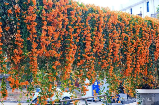 如果說農(nóng)場職工之家是溫柔小景,那這里就是氣勢磅礴的“花瀑奇觀”!長達(dá)上百米的炮仗花沿著道路兩旁垂落,宛如兩條奔騰的橙紅瀑布傾瀉而下,高大又壯觀。
