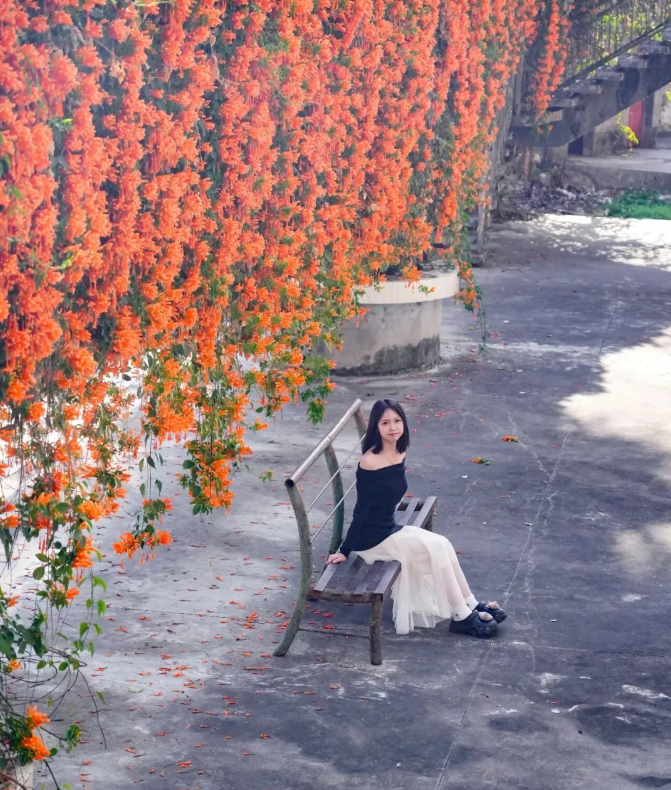 這里的炮仗花是貼心的“低門檻浪漫”!一面花墻絢爛綻放,花朵位置不高,伸手就能與繁花同框,完全不用費力找角度?;▔ε缘膹?fù)古座椅和樓梯更是點睛之筆,滿滿的年代感撲面而來。