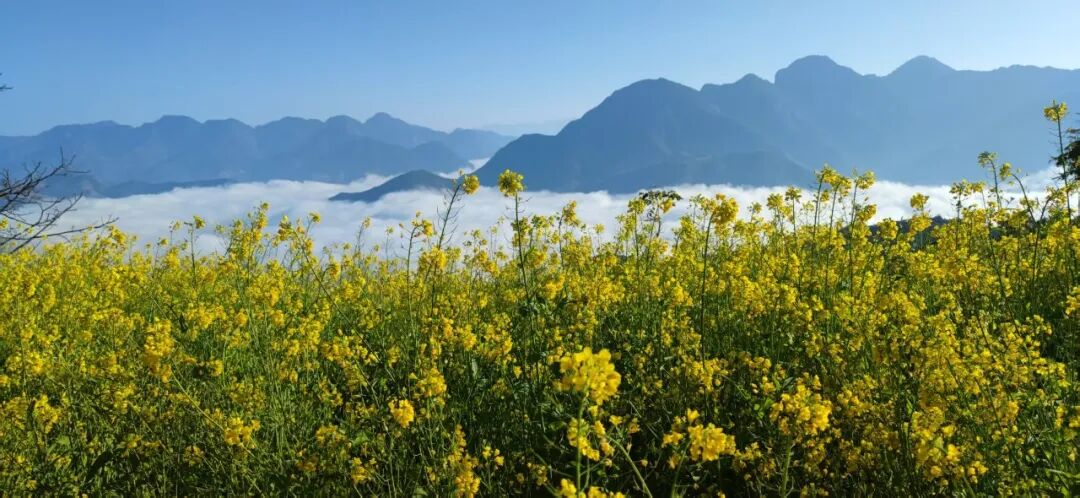 油菜花海與云海相映成趣,田埂間分布著多個景觀觀賞點。晨起時分,薄霧輕籠原野,翻涌的云海在山巒間舒展漫卷,與金黃花田交相輝映,形成如夢似幻的自然景觀。置身田間,可見花枝上嫩黃花朵次第綻放,微風拂過泛起層層金浪;部分枝頭已結出飽滿菜莢,陽光穿透莢皮可見排列整齊的嫩綠色菜籽,彰顯著豐收的希望。