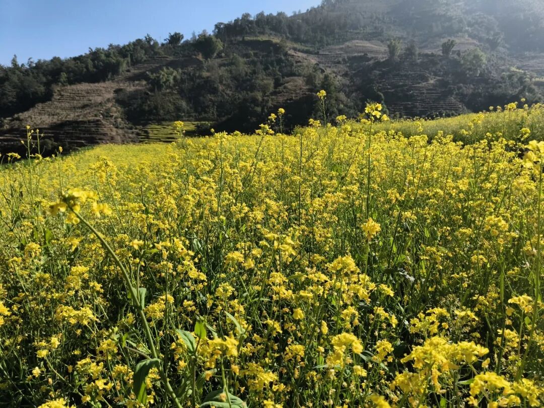 陽光穿透薄霧,為大朝山西鎮(zhèn)的山野和田野披上金色外衣。當前,全鎮(zhèn)1000余畝油菜花正值盛花期與結果期交替時節(jié),梯田間金黃的花海連綿不絕,構成了一幅生動的田園山水圖景。