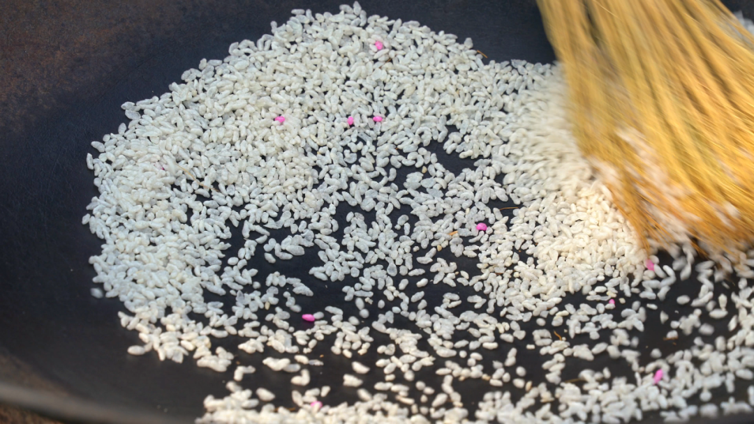 活動現(xiàn)場,婦女們分工協(xié)作,精選的糯米先上鍋蒸煮至軟糯,隨后攤開晾曬脫水,再送入機(jī)器壓制成薄而均勻的扁米。鐵鍋燒熱注油,舀入一兩勺扁米,手持稻草扎成的特制工具快速翻炒,伴隨著“滋滋”的聲響,扁米在熱力作用下迅速膨脹,變身成金黃酥脆的米花,這時一股濃郁的米香撲鼻而來。