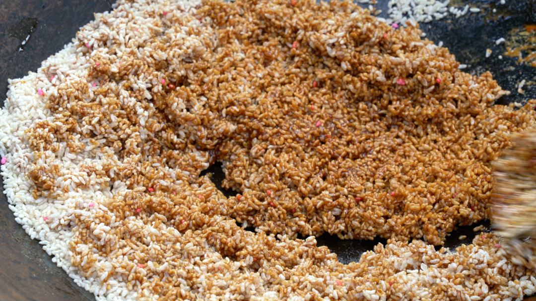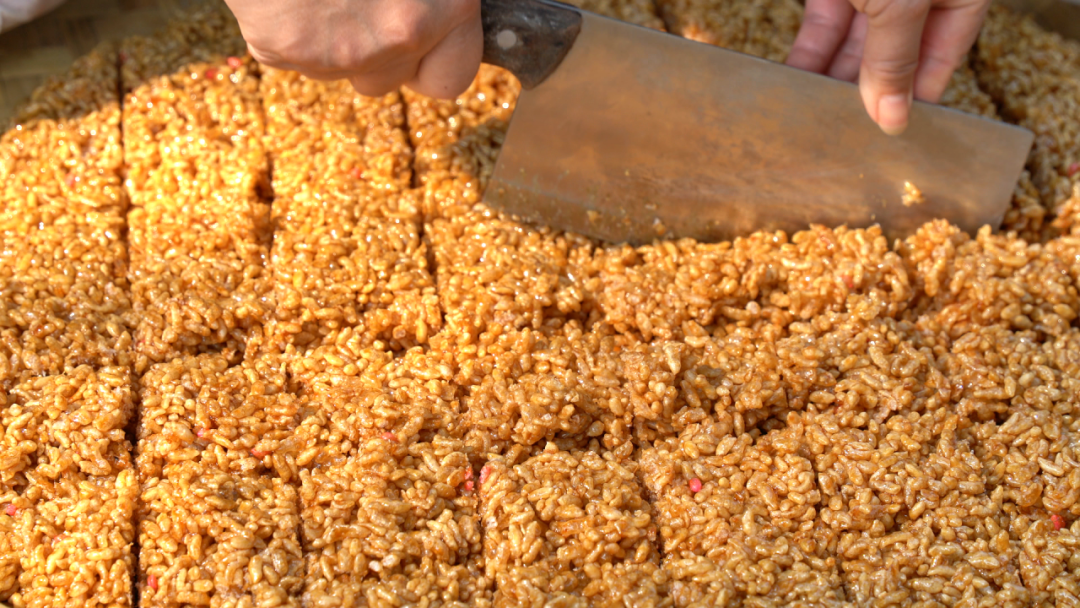 另一邊,新榨的紅糖塊被投入鍋中,然后加水慢熬,并不停攪拌,直至糖塊完全融化,熬煮出濃稠起泡、色澤紅亮的糖漿。這時把滾燙的紅糖水趁熱澆入炒好的米花中,鍋鏟翻飛間,糖漿與米花充分交融,每一粒米花都裹滿甜香。大家迅速將拌勻的食材壓實(shí)定型,待其冷卻變硬后,用刀劃切成大小均勻的方塊,一塊塊香甜軟糯的富寧米花就新鮮出爐了!