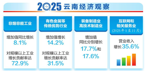 新動能的培育,離不開科技創(chuàng)新與產(chǎn)業(yè)創(chuàng)新的協(xié)同發(fā)力。2025年,云南實體經(jīng)濟和數(shù)字經(jīng)濟深度融合趨勢更加顯著。2025年1至11月,全省互聯(lián)網(wǎng)和相關服務業(yè)營業(yè)收入飆升35.6%。這一領域的持續(xù)高速增長,說明“數(shù)字云南”建設正從基礎建設邁向深度融合,成為激活經(jīng)濟系統(tǒng)效率的關鍵。