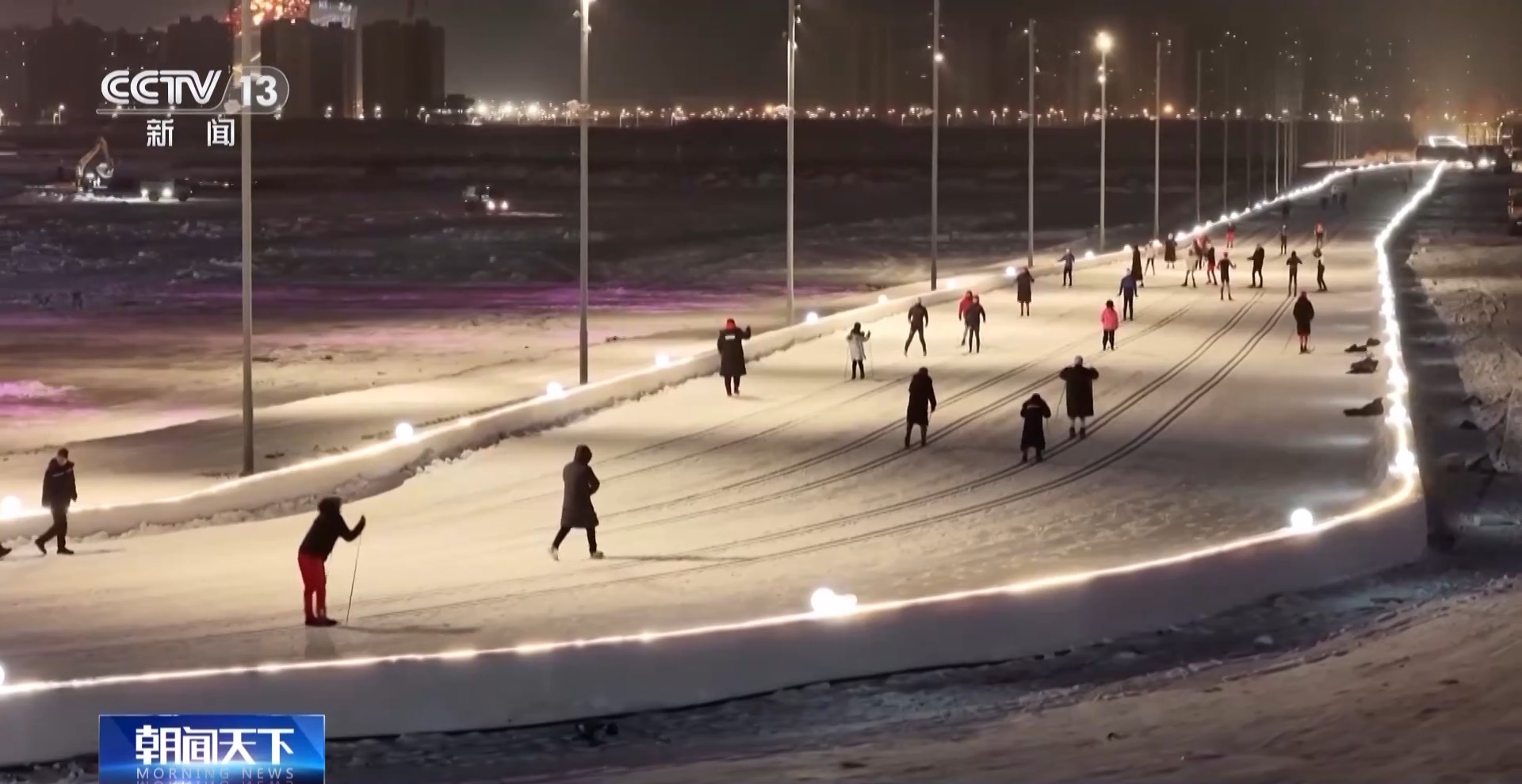 總臺記者 孫晶:我所在的地方是長春市伊通河畔的肆季南河岸線公園,這條全長5.7公里的雪道,是全國首創(chuàng)的城市燈光越野滑雪場地,溫度是零下22攝氏度,但現(xiàn)場十分熱鬧。