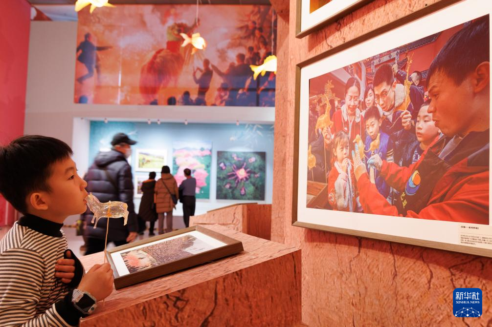 1月26日,在中國非物質(zhì)文化遺產(chǎn)館舉行的展覽現(xiàn)場,小朋友被一幅攝影作品吸引。