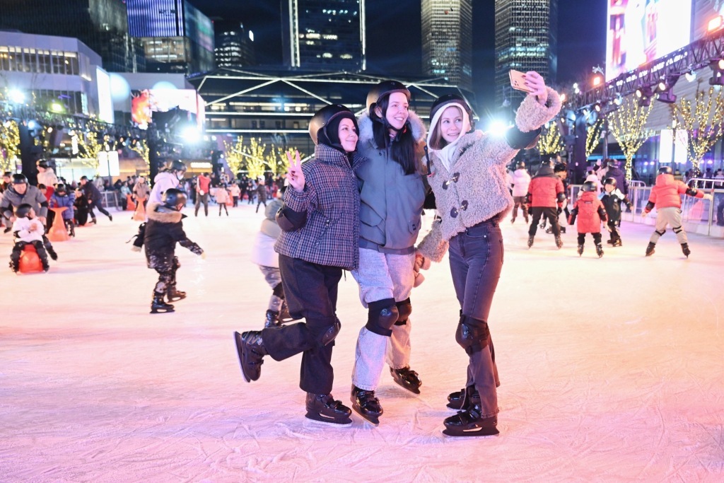 2025年12月31日晚,來(lái)自俄羅斯的達(dá)莎(右)和朋友在徐匯濱江露天冰場(chǎng)開啟跨年游。澎湃新聞?dòng)浾?朱偉輝 圖