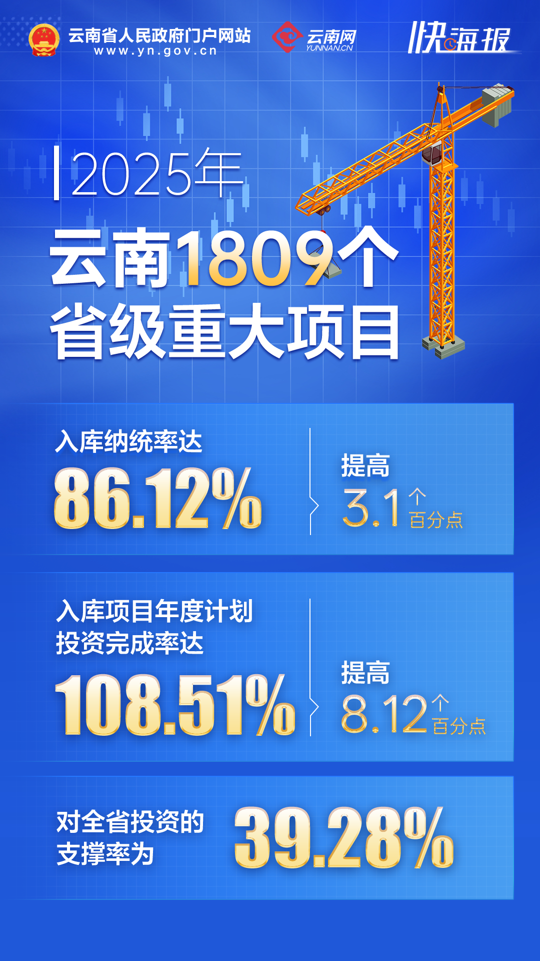 聚焦“大抓產(chǎn)業(yè)、大抓項(xiàng)目、大抓招商”,持續(xù)發(fā)揮省推進(jìn)有效投資重要項(xiàng)目協(xié)調(diào)機(jī)制作用,強(qiáng)化要素保障和協(xié)調(diào)服務(wù),2025年云南1809個(gè)省級(jí)重大項(xiàng)目入庫納統(tǒng)率達(dá)86.12%,入庫項(xiàng)目年度計(jì)劃投資完成率達(dá)108.51%,同比分別提高3.1和8.12個(gè)百分點(diǎn),對(duì)全省投資的支撐率為39.28%。其中,72個(gè)“重中之重”項(xiàng)目年度計(jì)劃投資完成率112.69%,384個(gè)民營企業(yè)投資項(xiàng)目年度計(jì)劃投資完成率90.66%。