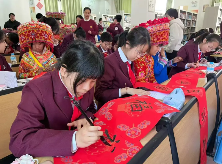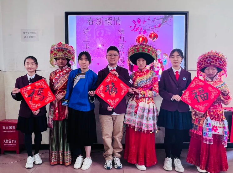 實(shí)踐課程環(huán)節(jié),上海市徐家匯書院老師朱夢(mèng)在線講授“圖書館第一課”,深入淺出地講解了如何高效利用圖書館資源,激發(fā)同學(xué)們的閱讀興趣與信息素養(yǎng)。田林三中老師主持“我們的節(jié)日·春節(jié)”互動(dòng)課堂,兩地學(xué)生分享家鄉(xiāng)年俗——從上海都市的現(xiàn)代年味到永勝他留人古樸的火塘守歲傳統(tǒng),不同的文化習(xí)俗在碰撞中交織出和諧共鳴,同學(xué)們現(xiàn)場(chǎng)展示才藝,揮毫?xí)鴮懘郝?lián)與“福”字,并交換親手制作的手工藝品與紀(jì)念品,現(xiàn)場(chǎng)氣氛溫馨熱烈。
