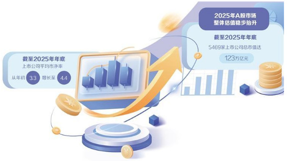 “投資有回報—資金積極入市—融資效率提升—上市公司質量提高”這一正向循環(huán)逐步形成,上市公司市值增長是客觀映射。數(shù)據(jù)顯示,2025年A股市場整體估值穩(wěn)步抬升,截至2025年年底,5469家上市公司總市值達123萬億元,上市公司平均市凈率從年初3.3增長至4.4。此外,公募基金中A股配置比重增長2.4個百分點,反映出投資者對中國經(jīng)濟高質量轉型和企業(yè)科技創(chuàng)新發(fā)展的認可。