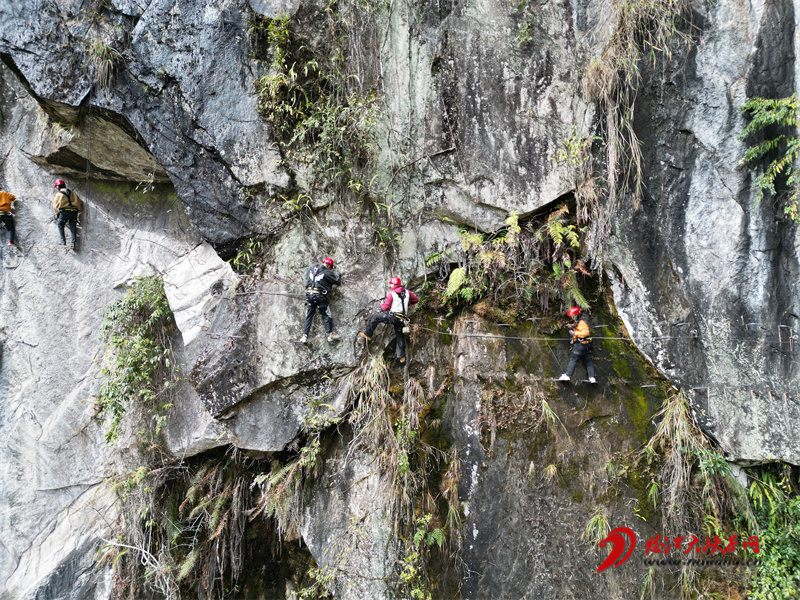 游客在拉馬底星谷景區(qū)體驗懸崖上的飛拉達攀巖項目。王玉林 攝