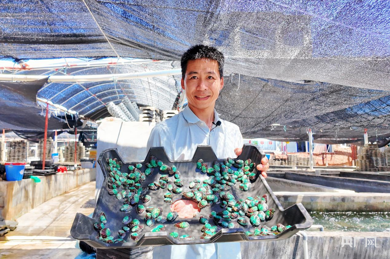澳角村村民陳澤賢展示自家培育的鮑魚苗(央廣網(wǎng)記者 ?龔雯 ?攝)