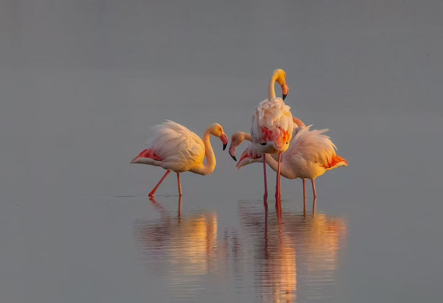 “火烈鳥是國家一級保護動物,十分罕見,它們愛吃咱鹽池里的鹵水蟲,所以年年都會來?!崩闲煲贿吔o記者科普,一邊叮囑觀鳥的“規(guī)矩”。語畢,停車。在一片開闊的湖面上,四只羽毛紅似晚霞、腿細長如玉簪的火烈鳥正在悠然覓食。早已有一群觀鳥愛好者蹲守多時,“大炮”似的長焦鏡頭比手臂還長?!傍B友”們見新來了人,頷首一笑,又趕忙把視線移回相機。