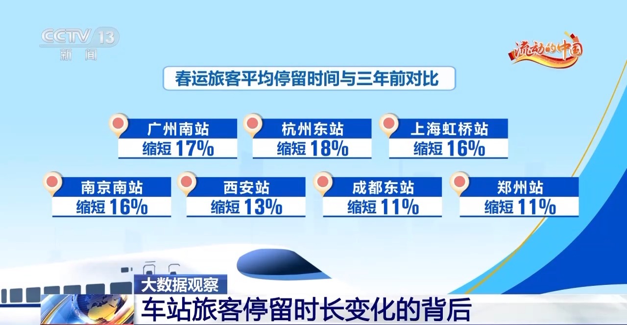 而旅客停留時間縮短的現(xiàn)象不只在廣州南站,大數(shù)據(jù)發(fā)現(xiàn),在比較繁忙的幾個車站,旅客平均停留時間也都比三年前的春運同期縮短了10%以上。