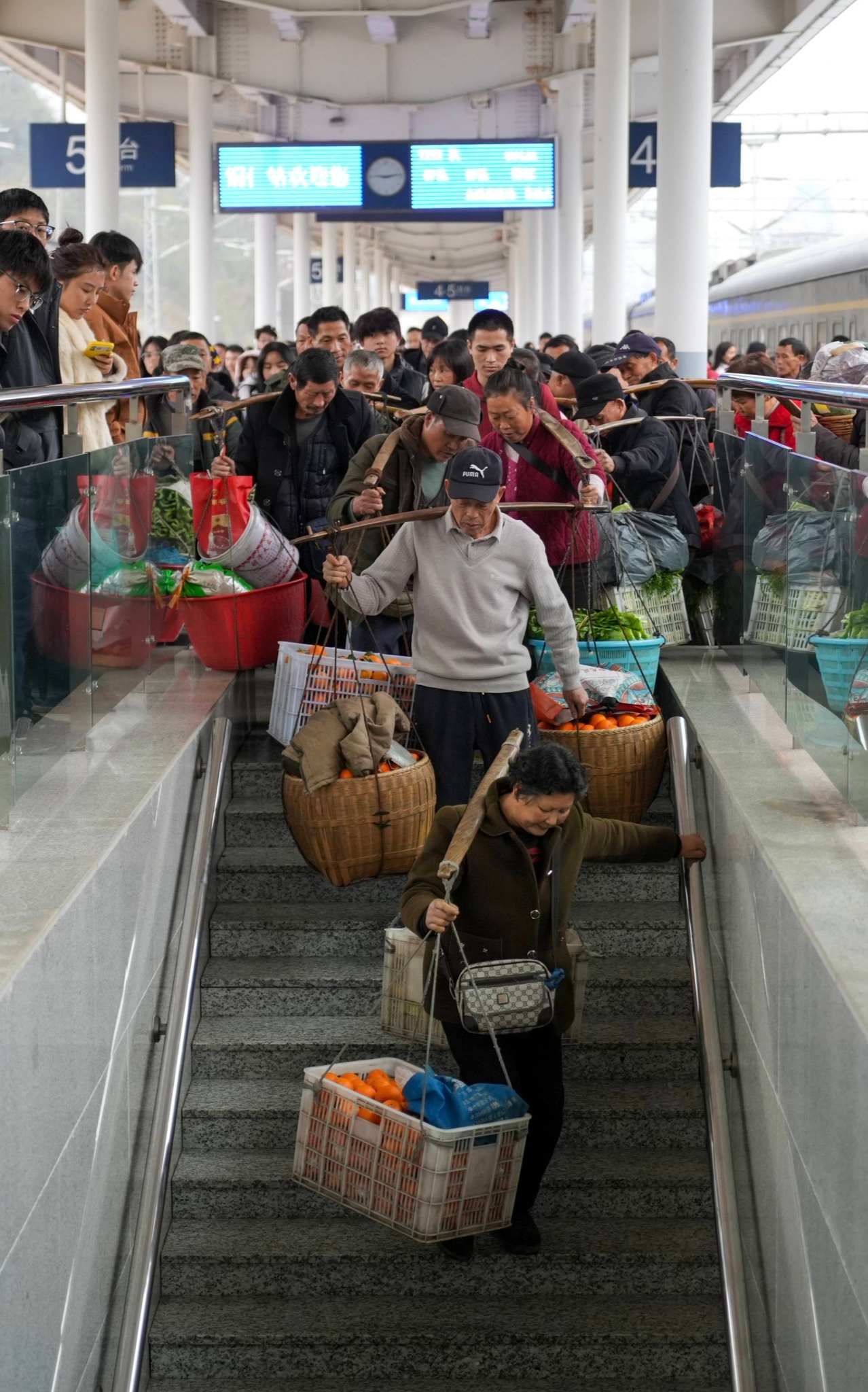 2月12日,在貴州省銅仁市銅仁火車站,村民挑著蔬果出站。 新華社記者 劉續(xù) 攝