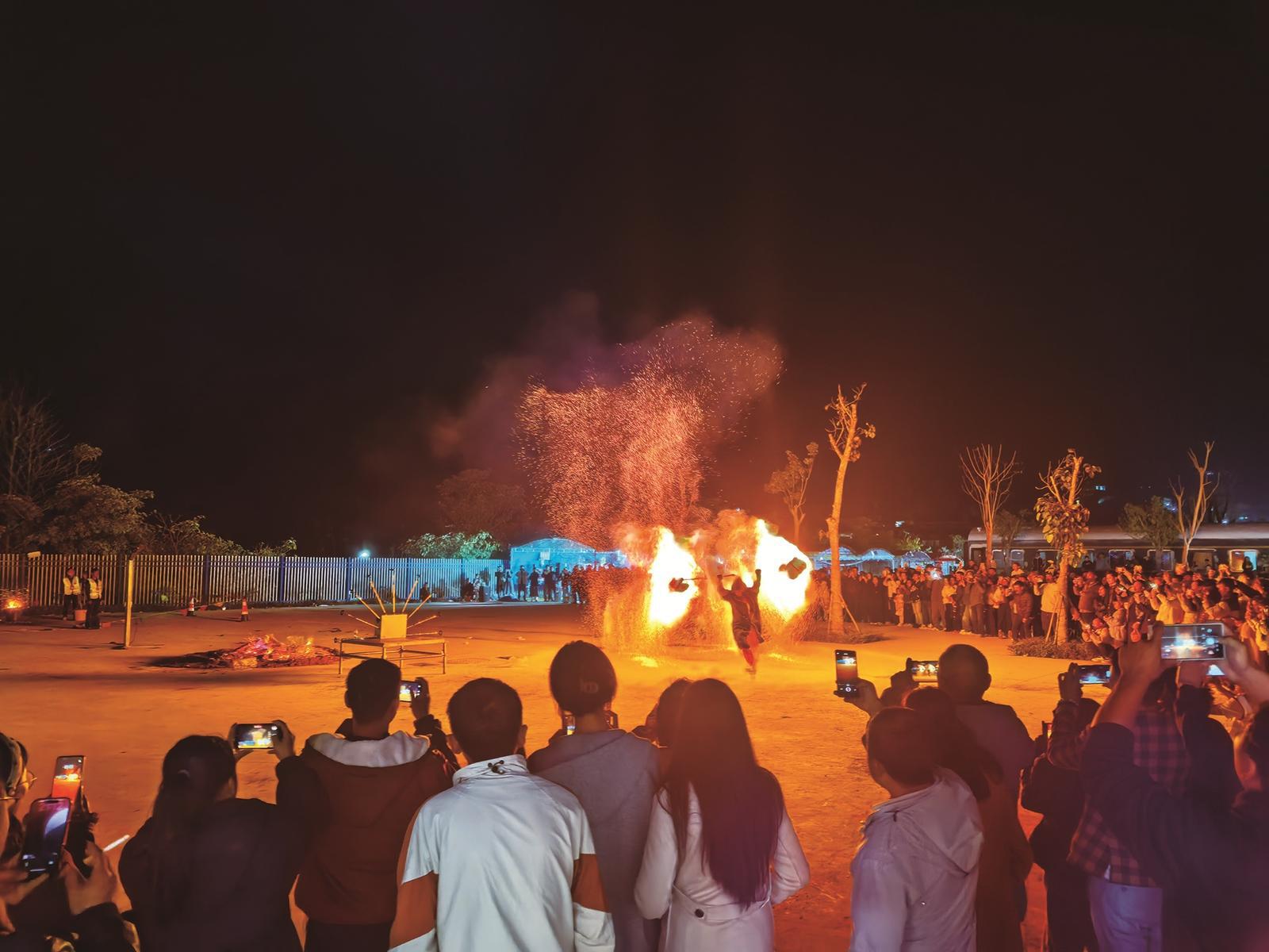 夜幕降臨,篝火燃起,打歌隊(duì)伍踏歌歡舞,歌聲與舞步傳遍街巷。打鐵花、火壺表演、風(fēng)火輪鐵水秀輪番上演,火光璀璨、氛圍熱烈,年味十足。